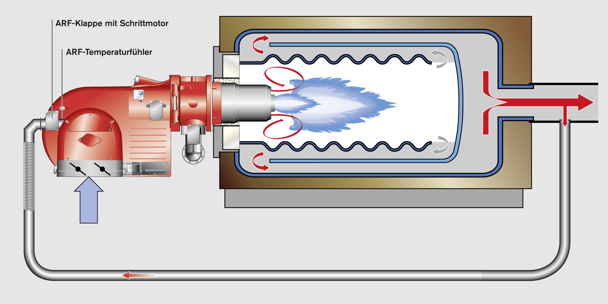 Die Abgasrückführung (ARF) bewirkt eine Reduzierung des Sauerstoffanteils pro m3 Luft, eine Erhöhung der Luftströmungs geschwindigkeit, eine kürzere Verweilzeit der Verbrennungsgase in der heißen Reaktionszone sowie ein Senken der Flammentemperatur.